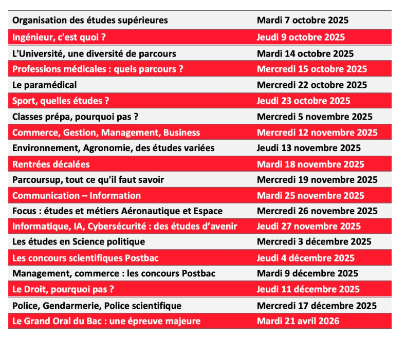 Vous y trouverez des informations fiables et des témoignages sur l’enseignement supérieur, les modes de formations, les filières et les débouchés. Les intervenants sont des professeurs, des responsables d’établissement, des étudiants engagés...
